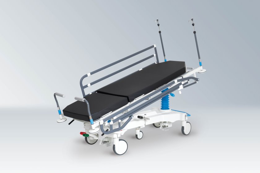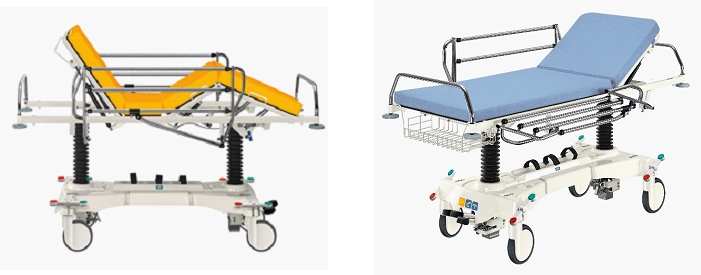 beim Aufstehen und schützt die Schienen vor Beschädigungen. Es gibt bis zu zwei optionale Griffpaare, um die Trage durch Krankenhauskorridore zu führen.Zusätzlich