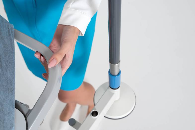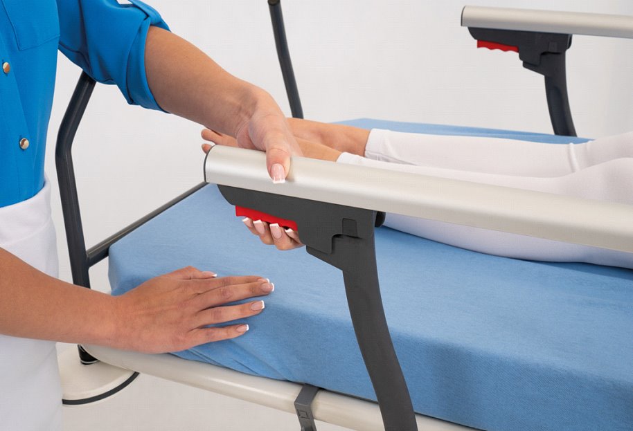 - Seitensicherungen schützen den Patienten auf einer Länge von 1480 mm. Sie haben keine scharfen Kanten und keine gefährlichen Stellen wo Finger einklemmen könnten.