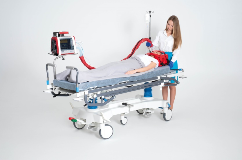 mit Gurten, die den Patienten auf der Matratze sichern.Einfach zu verwendende zweiteilige (FAWP-02.0) oder dreiteilige (FAWP-02.1) Liegeflächen für einfache Positionierung. Ein Korb mit großem