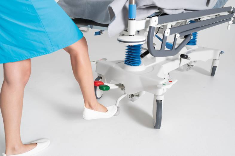 - Tritthebel am Fußende ermöglichen die Überwachung des Patienten bei gleichzeitiger Höhenverstellung und Verstellung von Trendelenburg.